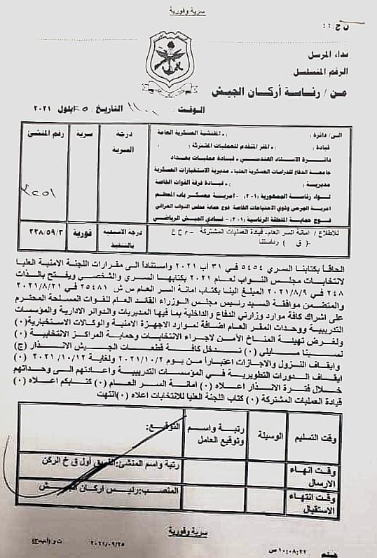 تنشر “الرشيد” برقية تتضمن دخول قطعات الجيش العراقي والاجهزة التابعة له حالة انذار القصوى لتأمين الانتخابات النيابية المقررة في 10 تشرين الاول المقبل.