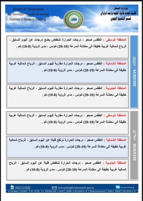أعلنت هيئة الأنواء الجوية، حالة طقس العراق خلال الأيام المقبلة، فيما اشارت الى انخفاض في درجات الحرارة.