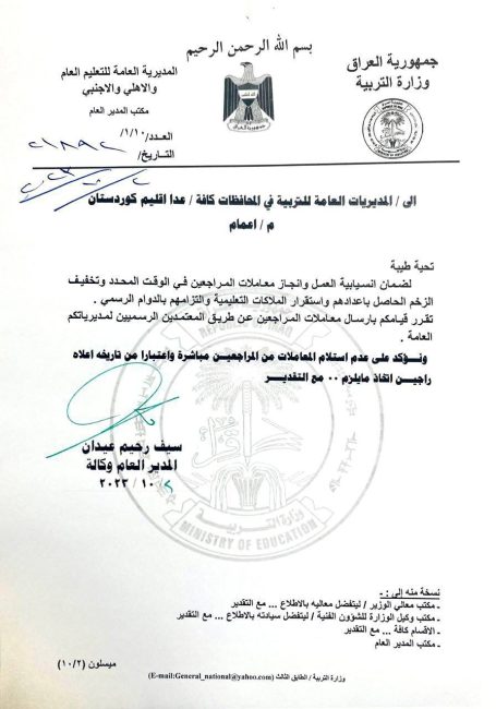 محلياتالتربية تصدر قراراً بشأن انجاز المعاملات.. وثيقة قبل سنتين 7 مشاهدات شارك وزارة التربيةوزارة التربية تقرر قيام المديريات إرسال معاملات المراجعين عن طريق المعتمدين الرسميين من دون الحاجة إلى حضور المراجع.التربية تصدر قراراً بشأن انجاز المعاملات.. وثيقة الوسوموزارة التربية العراقيةقد يهمك أيضا سياسة مجلس القضاء الأعلى ينشر تواريخ الاستحقاقات الدستورية قبل 22 دقيقة 6 مشاهدات الثامنة الكونغرس يضغط الفرامل: الدعم أم الفصائل؟ قبل 26 دقيقة 4 مشاهدات سياسة القائم بالاعمال الامريكي يؤكد حرص بلاده على مواصلة التعاون مع العراق لتحقيق التنمية والاستقرار قبل 30 دقيقة 4 مشاهدات سياسة السوداني: العلاقات بين العراق والولايات المتحدة تشهد تطوراً وتقدماً مستمراً قبل 32 دقيقة 3 مشاهدات أمن وكالة الاستخبارات تعلن فتح باب التطوع على ملاكها بصفة شرطي عقد قبل 42 دقيقة 36 مشاهدات
