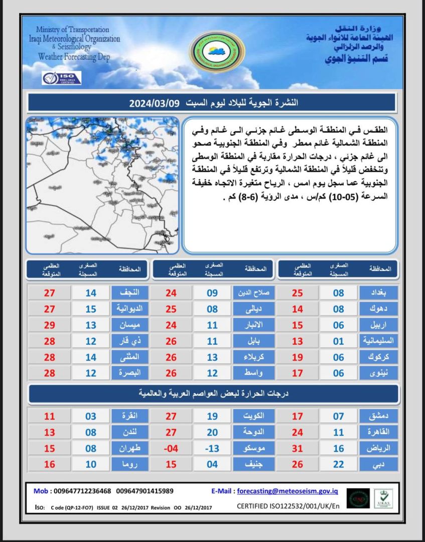 أعلنت هيئة الأنواء الجوية، حالة طقس العراق خلال الأيام المقبلة، فيما أشارت إلى أمطار في الشمال وغبار بالجنوب وانخفاض بدرجات الحرارة.