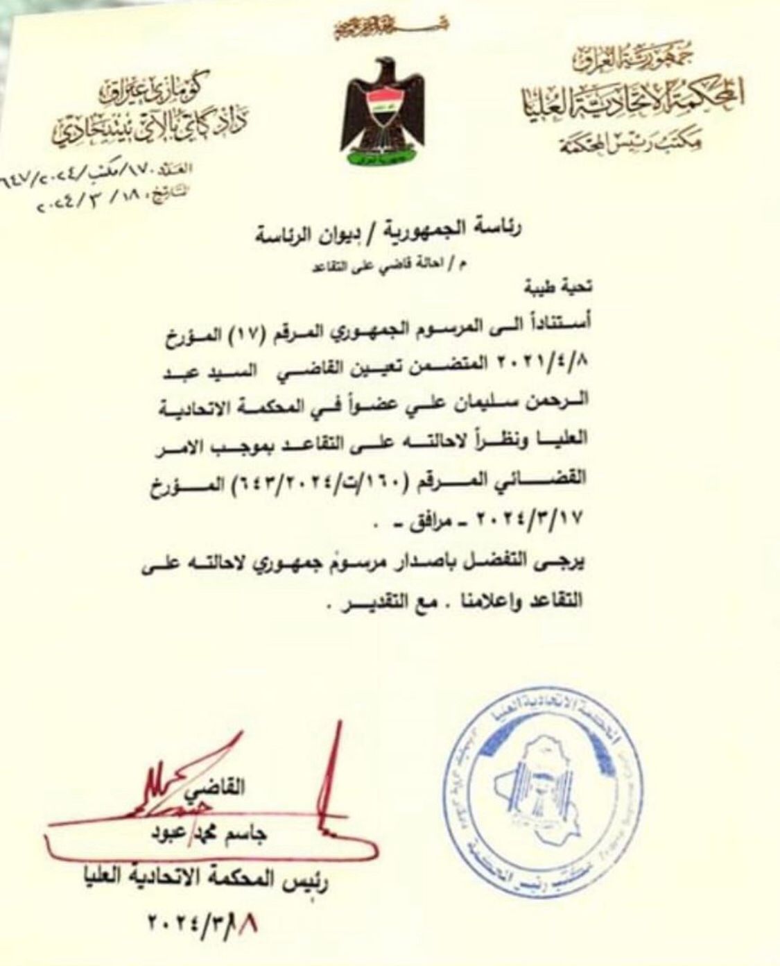 محلياتبالوثيقة.. المحكمة الاتحادية تحيل القاضي "عبد الرحمن زيباري" على التقاعد قبل سنتين 8 مشاهدات شارك المحكمة الاتحاديةبالوثيقة.. المحكمة الاتحادية تحيل القاضي "عبد الرحمن زيباري" على التقاعد الوسومالمحكمة الاتحاديةقد يهمك أيضا عربي ودولي إيران تصادر ناقلة نفط تحمل 6 ملايين لتر في خليج عمان قبل 7 ساعات 17 مشاهدات عربي ودولي موسكو: مصادرة الأصول الروسية تطلق برنامج التدمير الذاتي للاتحاد الأوروبي قبل 7 ساعات 9 مشاهدات رياضة منتخب الإمارات يـتأهل لنصف نهائي كـأس العرب بعد تغلبه على الجزائر بركلات الترجيح قبل 7 ساعات 10 مشاهدات رياضة درجال معتذراً للجماهير عن الخروج من كأس العرب: اللاعبون سيعوضون ذلك في آذار المُقبل قبل 8 ساعات 9 مشاهدات رياضة إصابة يزن النعيمات بقطع في الرباط الصليبي قبل 8 ساعات 15 مشاهدات