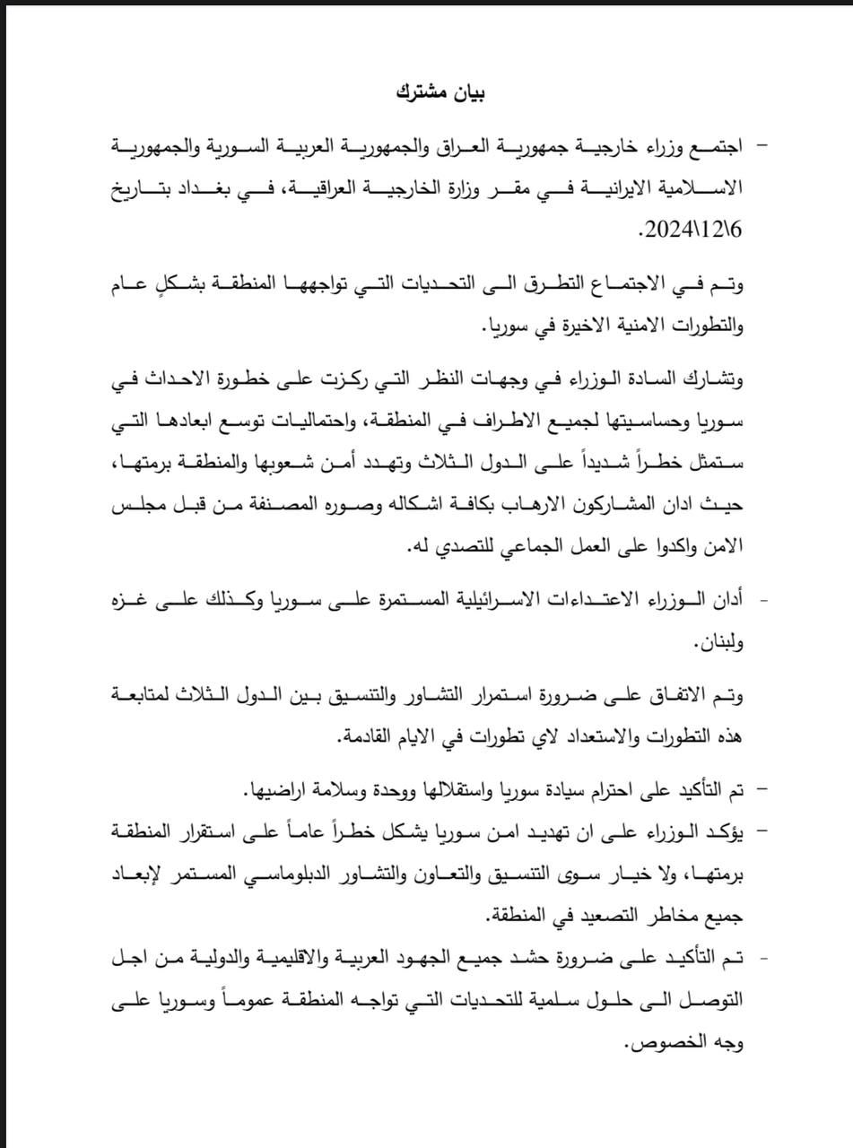 سياسةالرشيد تنشر البيان الصحفي المشترك صادر عن اجتماع وزراء خارجية العراق وسوريا وايران قبل سنة واحدة 13 مشاهدات شارك "الرشيد" تنشر البيان الصحفي المشترك صادر عن اجتماع وزراء خارجية العراق وسوريا وايران "الرشيد" تنشر البيان الصحفي المشترك صادر عن اجتماع وزراء خارجية العراق وسوريا وايران الوسوماجتماع وزراء خارجية العراق وسوريا وايرانالرشيدالعراقالعراق وسورياسورياوزراء خارجيةقد يهمك أيضا محليات توقف الرحلات الجوية في مطار بغداد بشكل مؤقت بسبب الضباب قبل 31 دقيقة 7 مشاهدات أقتصاد ارتفاع أسعار النفط وبرميل برنت عند أكثر من 61 دولاراً قبل 57 دقيقة 4 مشاهدات محليات طقس العراق.. أمطار متفرقة وانخفاض بدرجات الحرارة خلال الأيام المقبلة قبل ساعة واحدة 5 مشاهدات مع ياسر عامر من يحسم الرئاسات.. صناديق الاقتراع أم غرف المفاوضات؟؟ قبل 11 ساعة 8 مشاهدات أمن وكالة الاستخبارات والتحقيقات الاتحادية تتراجع عن بيانها وتنفي فتح باب التطوع على ملاكها قبل 11 ساعة 41 مشاهدات