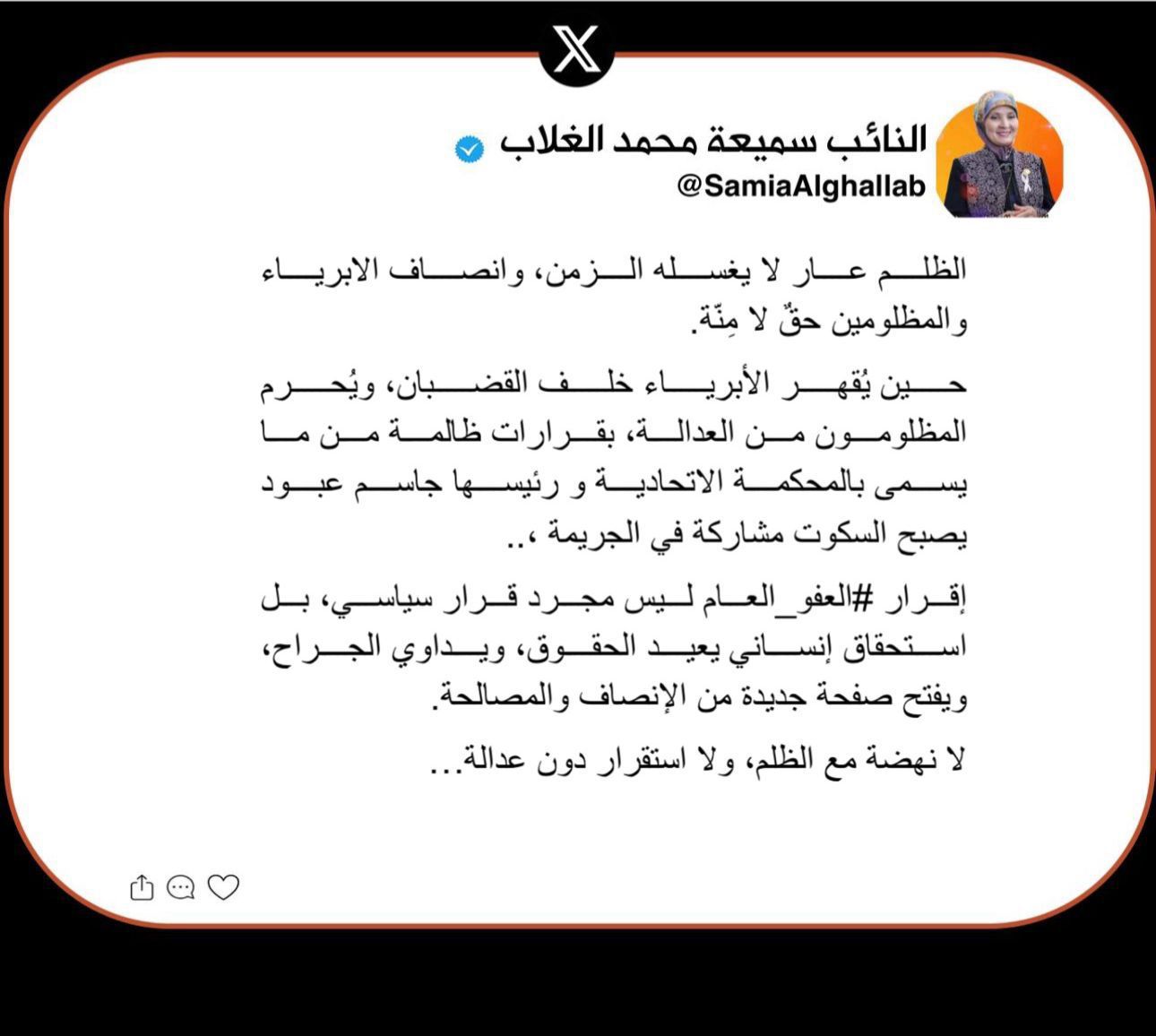 سياسةالنائب سميعة الغلاب: اقرار قانون العفو العام ليس مجرد قرار سياسي بل استحقاق انساني قبل 11 شهر 58 مشاهدات شارك النائب عن "تقدم" سميعة الغلاب: سنبقى اوفياء ثابتون حتى وان تخاذل من تخاذل او خان من خانالنائب سميعة الغلاب: اقرار قانون العفو العام ليس مجرد قرار سياسي بل استحقاق انساني الوسومالعفو العامالنائب سميعة الغلابسميعة الغلابقانون العفو العامقد يهمك أيضا سياسة المجلس السياسي الوطني يعلن الاتفاق على آليات تسهل حسم اختيار رئيس مجلس النواب قبل 3 ساعات 10 مشاهدات الحكم الرابع الـVAR يتلاعب بدورينا .. تفاصيل صادمة في الحكم الرابع قبل 4 ساعات 10 مشاهدات عربي ودولي الحكومة الليبية تعلن مقتل رئيس الأركان محمد الحداد ومرافقيه اثر تحطم طائرتهم في أنقرة قبل 4 ساعات 19 مشاهدات عربي ودولي مقتل رئيس الأركان الليبي "محمد الحداد" ومرافقيه بتحطم طائرتهم أثناء عودتهم من أنقرة قبل 4 ساعات 16 مشاهدات عربي ودولي وسائل إعلام تركية: العثور على حطام طائرة رئيس الاركان الليبي التي سقطت بعد إقلاعها من أنقرة قبل 4 ساعات 9 مشاهدات