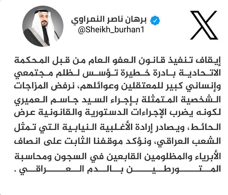 سياسةالنائب برهان النمراوي: إيقاف تنفيذ العفو العام من قبل المحكمة الاتحادية بادرة خطيرة تؤسس لظلم مجتمعي وانساني كبير للمعتقلين وعوائلهم قبل 11 شهر 11 مشاهدات شارك النائب برهان النمراوي يطالب القائد العام باتخاذ اجراءات للحد من الاساءات التي تخرج الحشد عن مسارهالنائب برهان النمراوي: إيقاف تنفيذ العفو العام من قبل المحكمة الاتحادية بادرة خطيرة تؤسس لظلم مجتمعي وانساني كبير للمعتقلين وعوائلهم الوسومالعفو العامالمحكمة الاتحاديةالنائبقد يهمك أيضا أقتصاد مصرف الرشيد ينفي عدم توفر سيولة أو الاستيلاء على أموال الزبائن قبل 6 دقائق 2 مشاهدات محليات بالوثيقة.. صدور مذكرة قبض بحق "حسين العنكوشي" بتهمة إهانة رمز ديني بطريقة علنية قبل 13 دقيقة 5 مشاهدات أقتصاد العمل تعلن إطلاق راتب المعين المتفرغ لشهر كانون الأول قبل 41 دقيقة 8 مشاهدات عربي ودولي حماس: الاحتلال يعرقل الانتقال للمرحلة الثانية من اتفاق وقف إطلاق النار في غزة قبل 43 دقيقة 5 مشاهدات عربي ودولي وزير الخارجية السوري: العلاقات مع روسيا تدخل مرحلة جديدة قبل ساعة واحدة 6 مشاهدات