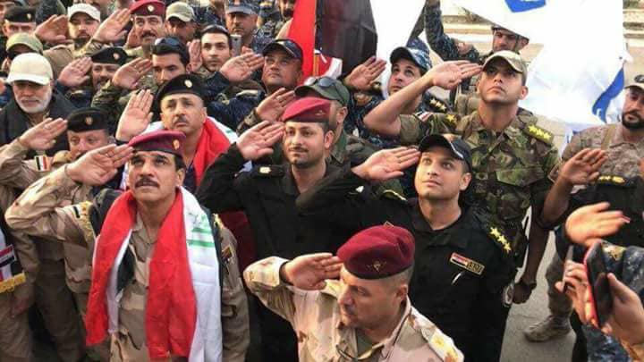 نائب قائد العمليات المشتركة الفريق الركن عبد الامير يارالله اشرف على رفع العلم العراقي بحضور قائد الشرطة الاتحادية رائد شاكر جودت وقيادات بارزة في الحشد الشعبي .