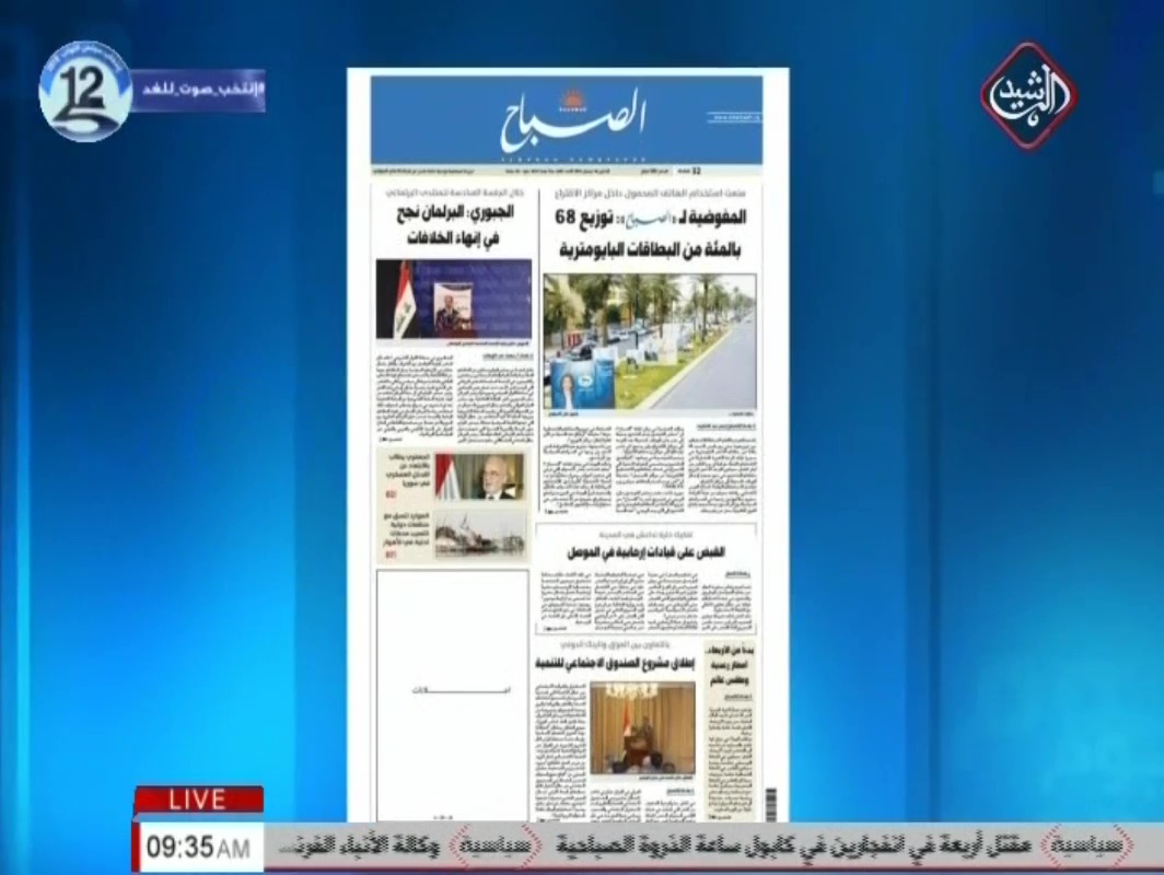 يوم جديدالصحافة اليوم (يوم جديد 2018/4/30) قبل 8 سنوات 3 مشاهدات 2 شارك قد يهمك أيضا عربي ودولي من التهديد إلى التصعيد.. ترامب يتوعد بحرب برية على المخدرات قبل 15 دقيقة 4 مشاهدات محليات طقس العراق.. أمطار وانخفاض بدرجات الحرارة خلال الأيام المقبلة قبل 38 دقيقة 12 مشاهدات عربي ودولي الرئيس الاوكراني يعلن الاتفاق مع واشنطن على الخطوات المقبلة وصيغ المحادثات قبل 10 ساعات 8 مشاهدات أقتصاد وزارة المالية: إجمالي نفقات الرواتب يبلغ 6 تريليونات دينار شهرياً قبل 11 ساعة 12 مشاهدات أقتصاد المالية: لا صحة لحجم الإنفاق الشهري على الرواتب بقيمة 8.5 تريليون دينار قبل 11 ساعة 7 مشاهدات