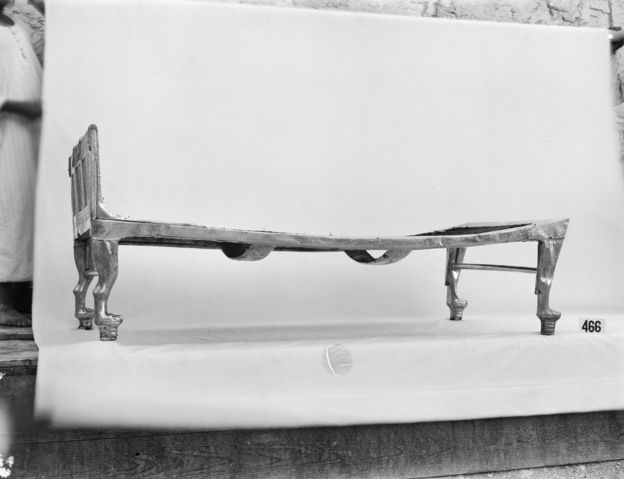 تظهر هذه الصورة غير المنشورة من قبل بعض أساليب العمل التي اتبعها بورتون. وقد وضع المصور سريرا من الخشب اكتشف ضمن محتويات المقبرة أمام خلفية بيضاء يحملها صبيان مصريان. ويظهر أحد الصبيين في يسار الصورة.