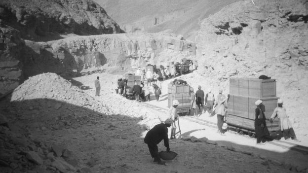 وتظهر هذه الصورة التي التقطت في مايو/ أيار عام 1923 العمل الشاق لنقل صناديق تحتوي على القطع الفنية من المقبرة في وادي الملوك في الأقصر لمسافة ستة أميال.