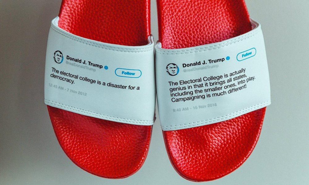 “سام موريسون” رجل أعمال أمريكي يعمل في مجال الإعلانات تمكن من الإتيان بفكرة للترويج لبضاعته وذلك بوضع تغريدات ترامب المتناقضة على الشباشب التي يبيعها.