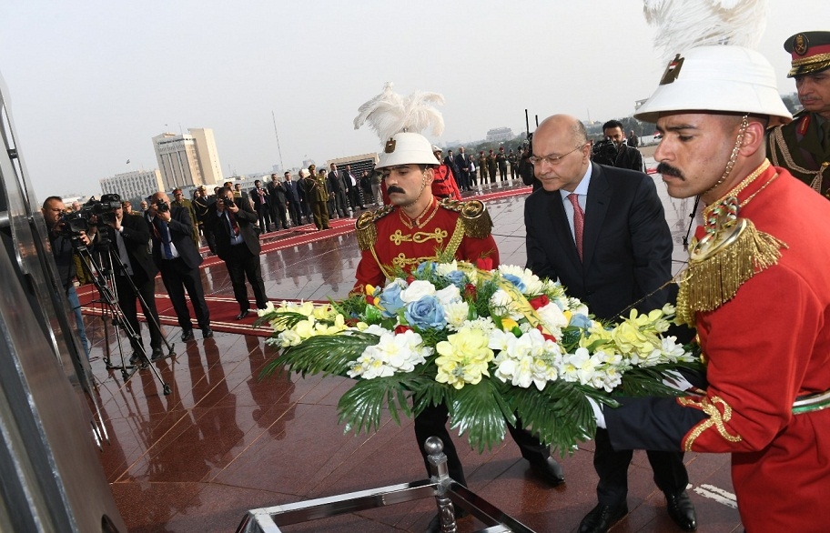 بمناسبة الذكرى الثامنة والتسعين لتأسيس الجيش العراقي، وضع رئيس الجمهورية برهم صالح، صباح اليوم الأحد، اكليلا من الزهور على نصب الجندي المهجول
