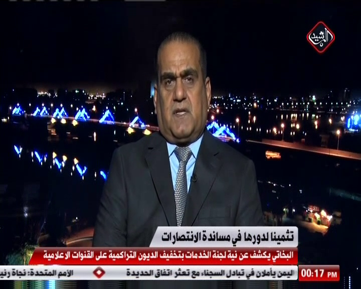 البخاتي كشف عن نية لجنة الخدمات النيابية الى تخفيف الاعباء عن المؤسسات الاعلامية من خلال تقليل الديون المتراكمة عليها، مشيرا الى ان لجنته تسعى لشمول جميع القنوات التي شاركت بعملية التغيير من 2003 الى الان وعمليات التحرير من الارهاب بقرار تخفيف الديون التراكمية عليها