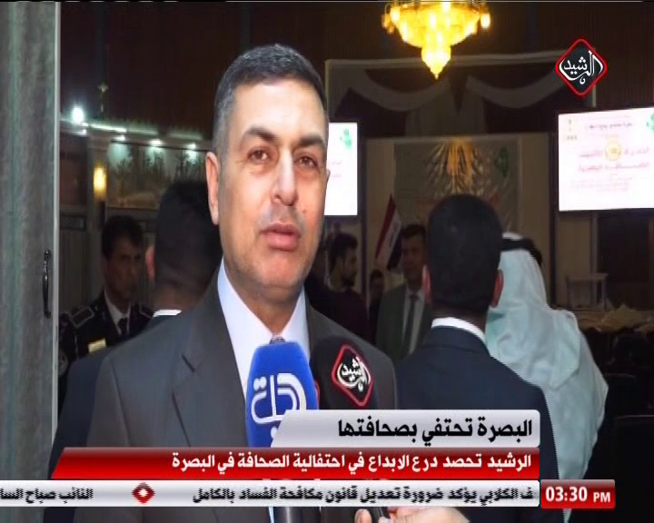 احتفلت نقابة الصحفيين العراقيين في البصرة بعيد الصحافة البصرية بايقاد شمعتها الثلاثين بعد المائة، وهي تزدهر بعطاء واقلام واصوات تصدح بنقل الحقيقة وبرجال يعملون في الميدان حيث من خلالها حصدت قناة الرشيد المتمثلة بمراسلها بالبصرة على درع الابداع لما قدمته من انجاز طيلة السنوات الماضية ولما تتمتع به هذه القناة من مهنية عالية في نقل الاحداث