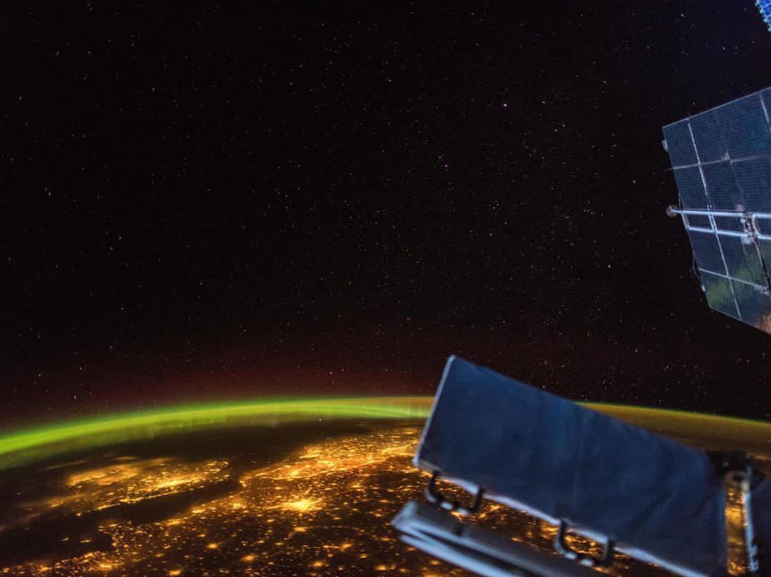لقطة بعدسة رائد الفضاء “أليكس جيرست” تظهر التوهج الليلي في الأفق والناتج عن التقاء الأضواء التي تنير ليل كوكبنا مع السماء المرصعة بالنجوم .