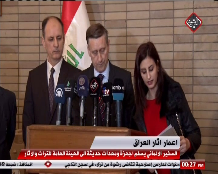 السفير الالماني قال في مؤتمر صحفي عقده بحضور وزير الثقافة العراقي عبد الامير الحمداني انه هذه المعدات ستسهم خلال المرحلة المقبلة في اعمار اثار محافظة نينوى التي دمرها ارهابيي داعش