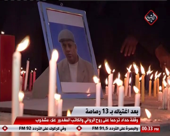 تكريما وترحما على روح الفقيد المغدور الروائي والكاتب علاء مشذوب والذي اغتيل بدم بارد على يد مسلحين مجهولين امام منزله مساء السبت الماضي، نظم العشرات من ابناء محافظة كربلاء وقفة حداد اوقدت خلالها الشموع في مكان الجريمة تعبيرا عن الحزن والاسى بهذا المصاب الاليم