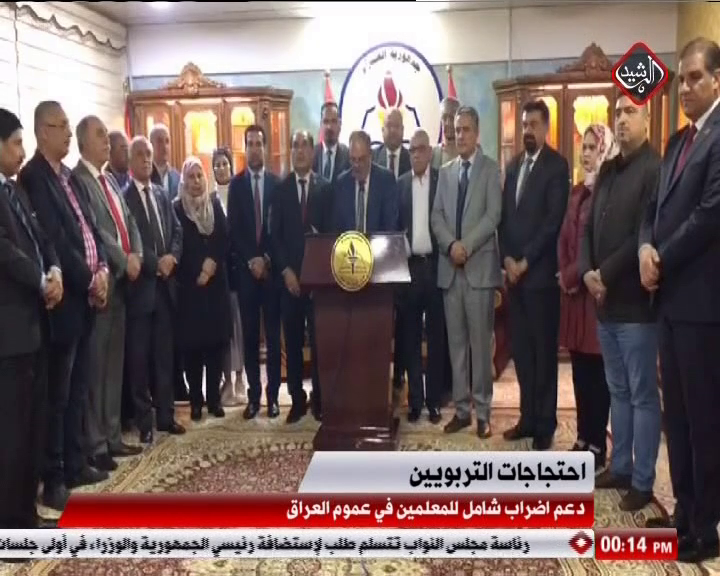نقيب الصحفيين العراقيين مؤيد اللامي قال في بيان مشترك ان عددا من الاتحادات والمنظمات والنقابات المهنية تدعم الاضراب الشامل الذي تقوم به حاليا الاسرة التعليمية في عموم العراق والهادف الى تحسين القطاع التربوي الذي شهد تدهورا واضحا خلال السنوات الماضية