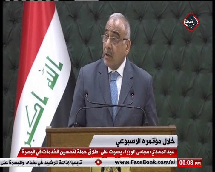 عبدالمهدي قال خلال مؤتمره الأسبوعي ان المجلس وافق على القيام بحملة لتحسين خدمات الماء والكهرباء والبنى التحتية في محافظة البصرة والاسراع بالتنفيذ والانجاز، مضيفا ان المجلس قرر الاستمرار بتوفير الاحتياجات الاساسية للعوائل النازحة والعائدة من المواد الاغاثية المختلفة