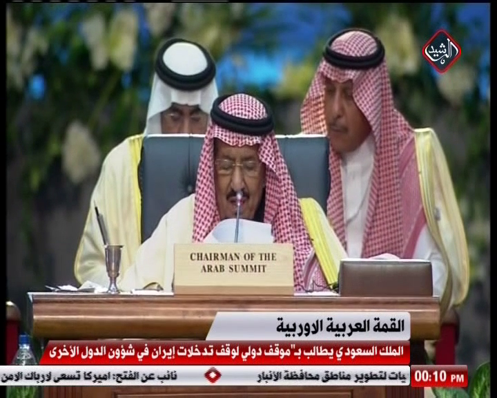 عبد العزيز دعا في كلمة له خلال قمة شرم الشيخ إيران الى الالتزام بقواعد حسن الجوار، مضيفا ان الصواريخ البالستية التي يطلقها الحوثيون تهدد الملاحة البحرية في مضيق باب المندب وان المملكة تؤكد أهمية الحل السياسي للأزمة اليمنية على أساس المبادرة الخليجية وقرار مجلس الامن الفين ومئتين وستة عشر