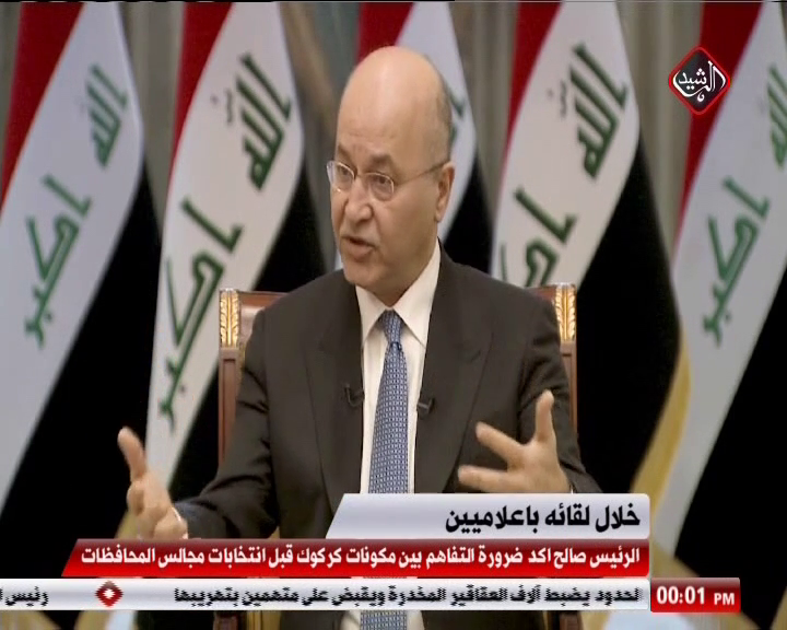 اكد رئيس الجمهورية برهم صالح في تصريح خاص للرشيد ضمن لقائه عدد من الاعلاميين العراقيين والذي سيعرض اليوم على شاشة الرشيد في تمام الساعة التاسعة من مساء اليوم اكد ضرورة التفاهم بين مكونات كركوك قبل انتخابات مجالس المحافظات للخروج بحل مسنود من بغداد ومتفاهم عليه في الإقليم.