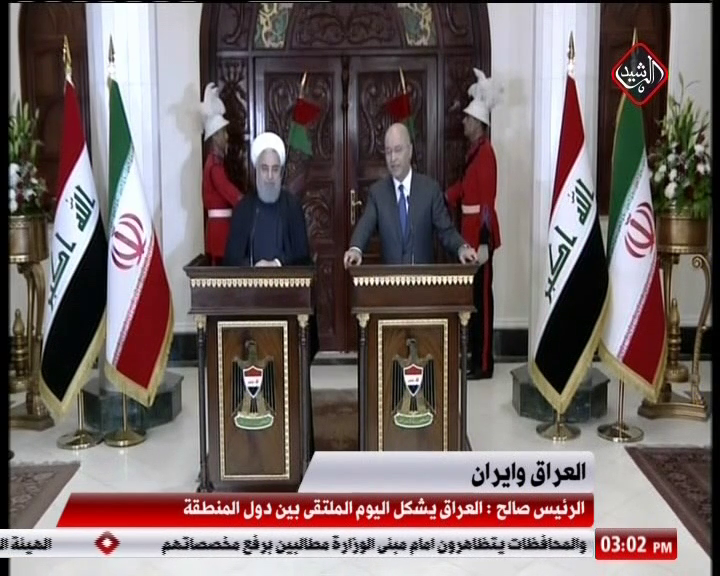 واجرى رئيس الجمهورية برهم صالح مراسم استقبال رسمية لنظيره الإيراني حيث اكد الرئيس في مؤتمر صحافي مشترك أن العراق يشكل اليوم الملتقى بين دول المنطقة، مشيرا إلى ضرورة خلق منظومة متكاملة من المصالح المشتركة