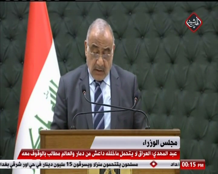 قراءة: عبد المهدي: العراق لايتحمل ماخلفه داعش من دمار والعالم مطالب بالوقوف معه