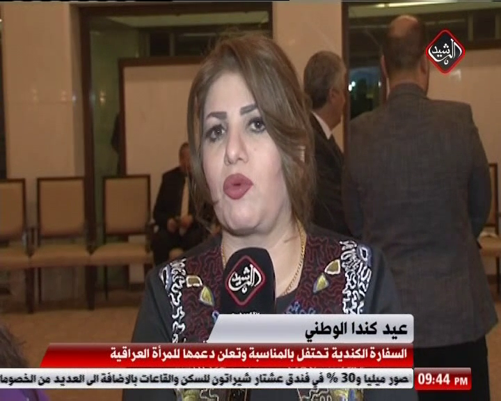 بمناسبة عيدها الوطني اقامت السفارة الكندية في العراق احتفالا حضرته شخصيات سياسية واعلامية واكاديمية، فيما اعلنت دعمها للمرأة العراقية مقدمة منحة مالية قدرها اربعة عشر مليون دولار لتفعيل دورها وتمكينها في المجتمع..