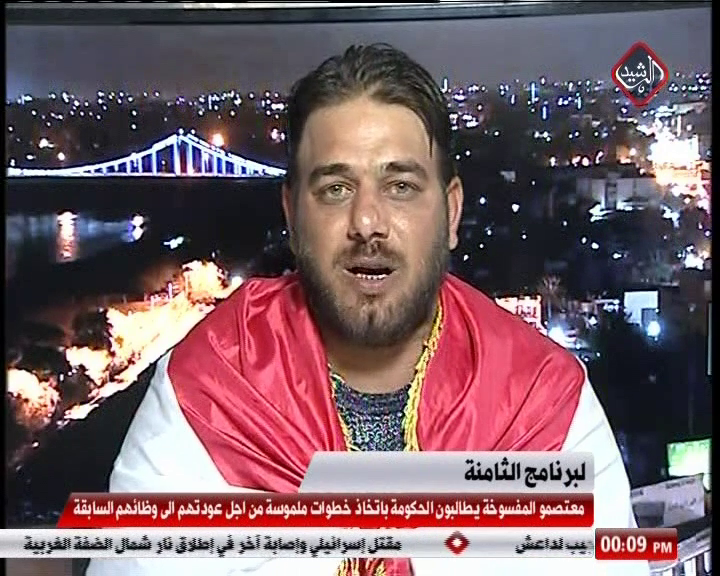طالب ممثل عن معتصمو المفسوخة عقودهم في ساحة التحرير ماجد عذاب في تصريح خاص لبرنامج الثامنة رئيسي مجلس الوزراء والنواب باتخاذ خطوات ملموسة من اجل عودتهم الى وظائهم السابقة في وزارتي الدفاع والداخلية