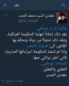 الاخبار العاجلةالصدر يعلن نهاية الحكومة ويهدد بالبراءة منها قبل 6 سنوات 4 مشاهدات شارك قد يهمك أيضا سياسة الخارجية ترحب بقرار ايطاليا إجراء مراجعة لإرشادات السفر الخاصة بمواطنيها الراغبين بزيارة العراق قبل ساعة واحدة 6 مشاهدات محليات التجارة تعلن ربط البطاقة التموينية بالوطنية إلكترونياً وتوجه لإعادة فتح الإضافة قبل ساعتين 9 مشاهدات أمن متهمان بالقتل والاغتصاب يهربان من سجن الاحداث في بغداد قبل 3 ساعات 11 مشاهدات أمن الحشد الشعبي يعلن اعتقال "واثق البطاط" بتهمة الإساءة إلى المؤسسات الأمنية قبل 3 ساعات 48 مشاهدات عربي ودولي وزير الخارجية الأمريكي: أحرزنا تقدما ملحوظًا على طريق إنهاء الحرب في أوكرانيا قبل 4 ساعات 8 مشاهدات