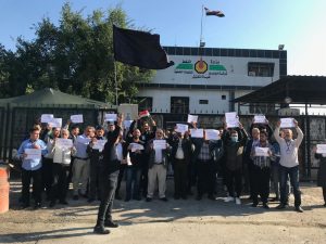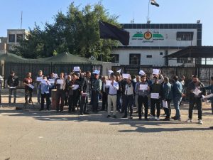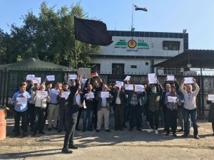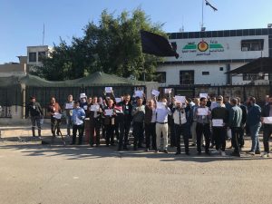 تظاهر العشرات من موظفي هيئة التفتيش لشركة المنتجات النفطية امام مبنى الهيئة، اليوم الثلاثاء، احتجاجا على تصرفات مدير الهيئة الجديد علي السنيد مطالبين باقالته.
