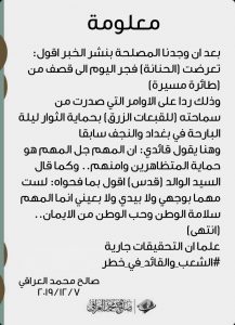 وقال العراقي في منشور على صفحته في موقع التواصل الاجتماعي “فيسبوك”، إن “الحنانة تعرضت فجر اليوم الى قصف من طائرة مسيرة وذلك ردا على الاوامر التي صدرت من سماحته (للقبعات الزرق) بحماية الثوار ليلة البارحة في بغداد والنجف سابقا”.