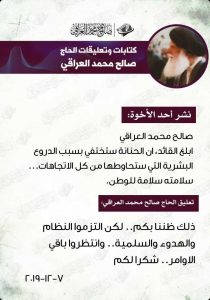 الاخبار العاجلةمقرب من الصدر لأتباع التيار: التزموا النظام والهدوء والسلمية وانتظروا الأوامر قبل 6 سنوات 3 مشاهدات شارك قد يهمك أيضا أمن فصائل المقاومة تعلن تنفيذ 41 عملية ضد القواعد الامريكية في العراق والمنطقة قبل 7 ساعات 18 مشاهدات أمن سقوط طائرة مسيرة في محيط مطار بغداد الدولي قبل 7 ساعات 16 مشاهدات سياسة ائتلاف ادارة الدولة يعرب عن وقوفه الى جانب الشعبين الإيراني واللبناني قبل 7 ساعات 18 مشاهدات سياسة ائتلاف ادارة الدولة يدين الاعتداءات على المؤسسات الحكومية والقوات الامنية والبعثات الدبلوماسية قبل 8 ساعات 15 مشاهدات سياسة أعضاء ائتلاف ادارة الدولة يؤكدون رفضهم اتخاذ أراضي العراق منطلقاً للاعتداء على أية دولة قبل 8 ساعات 14 مشاهدات