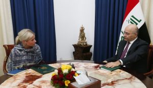 استقبل رئيس الجمهورية برهم صالح، اليوم الأحد في قصر السلام ببغداد، الممثلة الخاصة للأمين العام للأمم المتحدة في العراق جينين هينيس بلاسخارت.