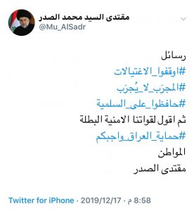 وبعث الصدر من خلال تغريدة له على تويتر، “أوقفوا الاغتيالات، المجرَب لا يُجرَب، وحافظوا على السلمية”.