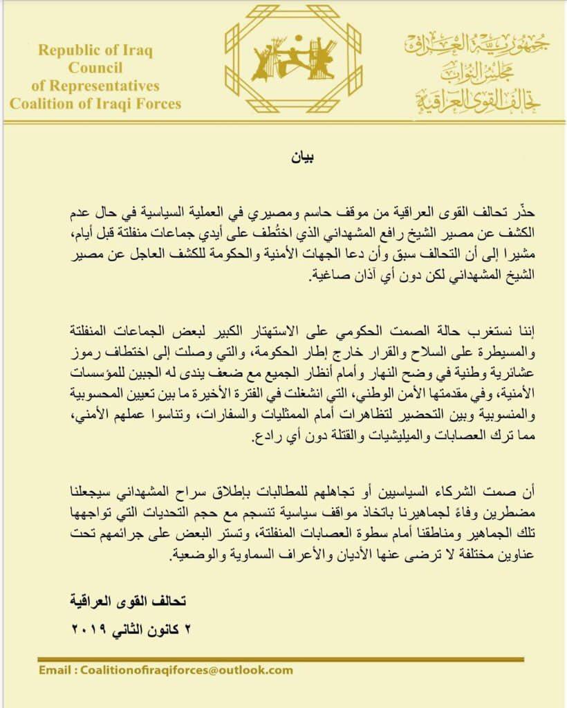 وقال التحالف في بيان تلقته الرشيد، “اننا نستغرب حالة الصمت الحكومي على الاستهتار الكبير لبعض الجماعات المنفلتة والمسيطرة على السلاح والقرار خارج إطار الحكومة، والتي وصلت الى اختطاف رموز عشائرية وطنية في وضح النهار وأمام انظار الجميع مع ضعف يندى له الجبين للمؤسسات الأمنية، وفي مقدمتها الامن الوطني، التي انشغلت في الفترة الأخيرة ما بين تعيين المحسوبية وبين التحضير لتظاهرات أمام الممثليات والسفارات وتناسوا عملهم الأمني، مما ترك العصابات والميليشيات والقتلة بدون أي رادع”.
