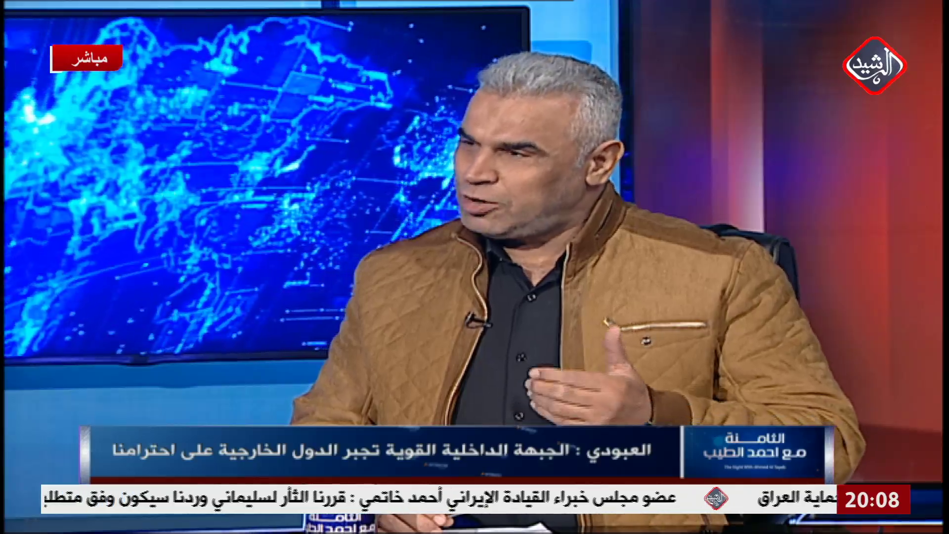 الثامنةالثامنة مع احمد الطيب .. بعد عملية المطار .. واشنطن تنفذ وطهران تهدد 2020/1/4 قبل 6 سنوات 1 مشاهدة شارك قد يهمك أيضا سياسة العراق وباكستان يناقشان الارتقاء بواقع التبادل التجاري والسجناء والعمالة قبل 8 ساعات 10 مشاهدات مع ياسر عامر الفصائل تنزع سلاحها و”النجباء والكتائب” يرفضون!! قبل 8 ساعات 12 مشاهدات سياسة المجلس السياسي الوطني يقرر عقد اجتماع الثلاثاء المقبل لمواصلة النقاشات قبل 9 ساعات 17 مشاهدات سياسة المجلس السياسي الوطني يؤكد الالتزام بالتوقيتات الدستورية لجلسة البرلمان قبل 9 ساعات 14 مشاهدات عربي ودولي السويد.. حادثة تدنيس جديدة للمصحف في مسجد ستوكهولم تؤجج مشاعر المسلمين قبل 9 ساعات 9 مشاهدات