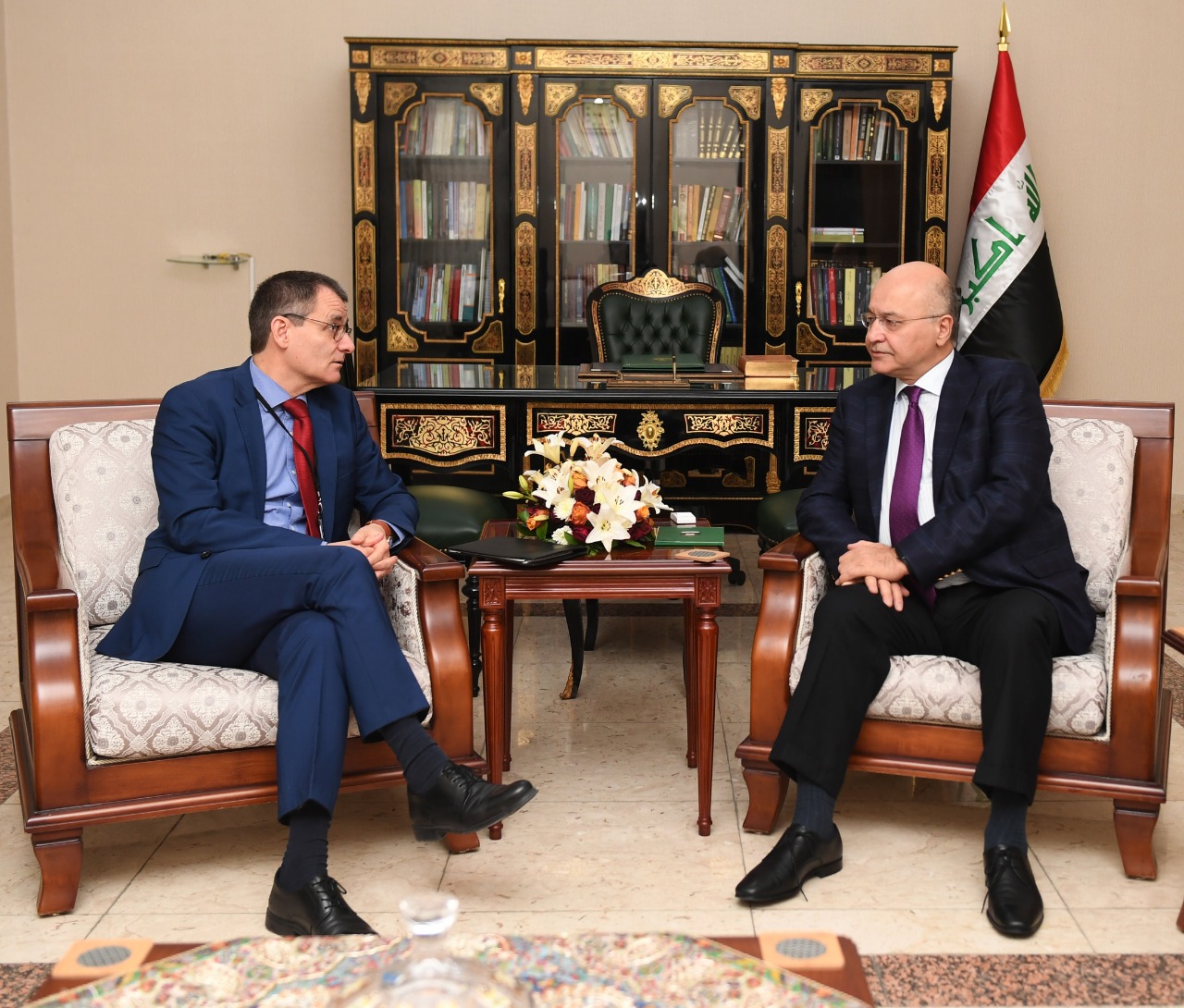 الرئيس صالح يؤكد لسفير الاتحاد الاوروبي تمسك العراقيين بسلامة ارضهم ورفضهم تحولها لساحة صراع