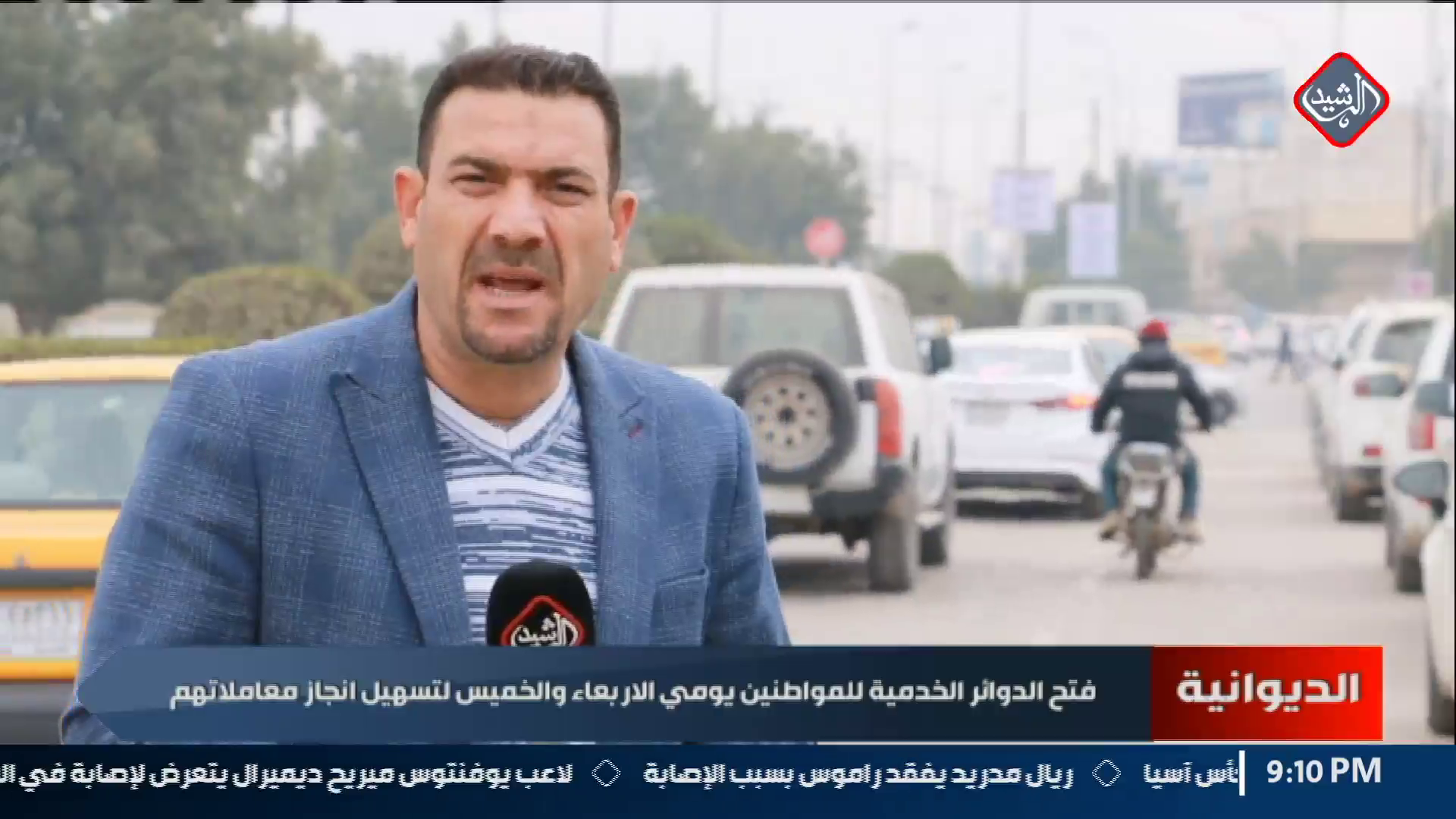 تقاريرفتح الدوائر الخدمية للمواطنين يومي الاربعاء والخميس لتسهيل انجاز معاملاتهم قبل 6 سنوات 3 مشاهدات شارك قد يهمك أيضا أمن الاستخبارات العسكرية تحبط عملية تهريب مشتقات نفطية وتلقي القبض على منفذها في نينوى قبل 3 دقائق 2 مشاهدات سياسة القاضي زيدان: الدستور نص على انتخاب رئيس مجلس النواب ونائبيه في الجلسة الأولى وأي اجتهاد يعد مخالفة دستورية قبل 19 دقيقة 3 مشاهدات سياسة مجلس ذي قار يصوّت على اختيار هيثم عزيز محافظاً قبل 25 دقيقة 5 مشاهدات سياسة مجلس محافظة ذي قار يصوت بالموافقة على استقالة المحافظ مرتضى الإبراهيمي قبل 45 دقيقة 5 مشاهدات محليات التربية تصدر قراراً يخص الطلبة الراسبين في مدارس المتميزين وثانويات كلية بغداد قبل 51 دقيقة 8 مشاهدات