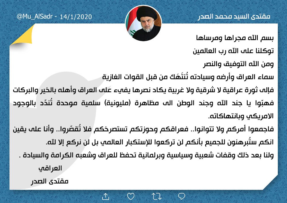 الاخبار العاجلةمحلياتالصدر يدعو لتظاهرة مليونية تنديداً بالوجود الامريكي قبل 6 سنوات 1 مشاهدة شارك قد يهمك أيضا أقتصاد ارتفاع أسعار صرف الدولار مقابل الدينار العراقي مع الاغلاق قبل 36 دقيقة 9 مشاهدات محليات اكتشاف أثري في العراق يوثق تعايشا دينيا فريدا قبل 15 قرنا قبل ساعة واحدة 7 مشاهدات الاخبار العاجلة المجر لا تستبعد اندلاع حرب في أوروبا خلال عام 2026 قبل ساعة واحدة 7 مشاهدات عربي ودولي روسيا تعتزم إنشاء محطة نووية على القمر لتوفير الطاقة لبرنامجها الفضائي قبل ساعة واحدة 8 مشاهدات محليات التربية توافق على تمديد فترة التقديم للامتحانات التمهيدية (الخارجي) إلى نهاية العام الحالي قبل ساعتين 6 مشاهدات