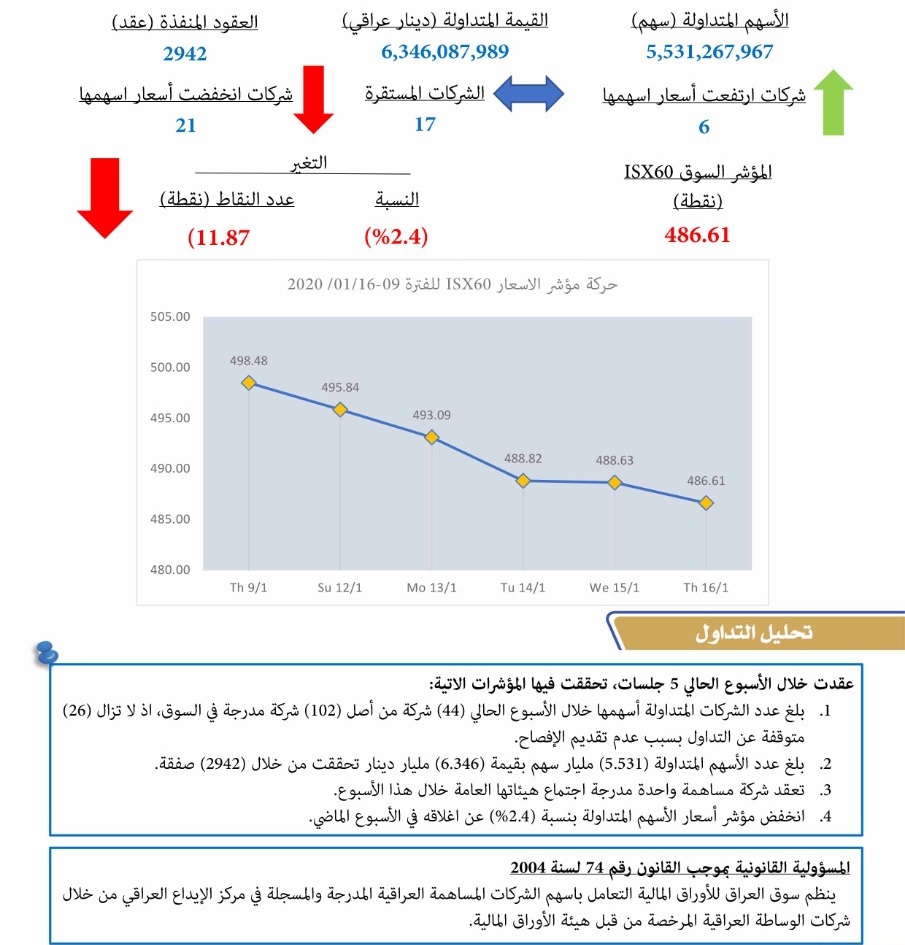 3. اغلق مؤشر الاسعار المتداولة ISX60 على 486.61 نفطة مسجلا انخفضا بنسبة (%2.4) عن اغلاقه في الأسبوع الماضي.