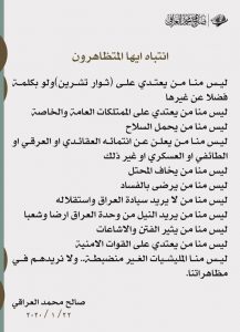 وذكر العراقي في منشور له على "فيسبوك"، "انتباه ايها المتظاهرون، ليس منا من يعتدي على (ثوار تشرين) ولو بكلمة فضلا عن غيرها، ليس منا من يعتدي على الممتلكات العامة والخاصة، ليس منا من يحمل السلاح ، ليس منا من يعلن عن انتمائه العقائدي او العرقي او الطائفي او العسكري او غير ذلك، ليس منا من يخاف المحتل، ليس منا من يرضى بالفساد، ليس منا من لا يريد سيادة العراق واستقلاله، ليس منا من يريد النيل من وحدة العراق ارضا وشعبا".