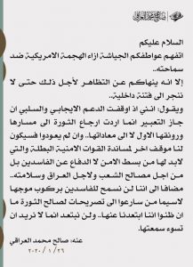 وذكر صالح محمد العراقي المقرب من زعيم التيارالصدري في منشور له على على موقع التواصل الاجتماعي فيسبوك، “اتفهم عواطفكم الجياشة ازاء الهجمة الامريكية ضد سماحته”، مضيفاً أن “الصدر ينهاكم عن التظاهر لاجل ذلك حتى لا ننجر الى فتنة داخلية”.