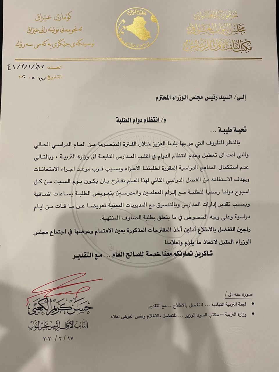 الاخبار العاجلةمحلياتبالوثيقة .. نائب رئيس البرلمان حسن الكعبي يقترح جعل يوم السبت دواماً رسمياً للطلبة قبل 6 سنوات 4 مشاهدات شارك قد يهمك أيضا أمن إنقاذ 4 عمال سوريين إثر انهيار مبنى متهالك في منطقة الأعظمية ببغداد قبل 11 دقيقة 3 مشاهدات أمن الاستخبارات العسكرية تطيح بثلاثة ارهابيين في بغداد قبل 17 دقيقة 3 مشاهدات سياسة مجلس النواب يعلن فتح باب الترشيح لمنصب رئيس الجمهورية قبل 18 دقيقة 3 مشاهدات عربي ودولي تركيا: توقيف 125 شخصا بشبهة الانتماء إلى "داعش" قبل 30 دقيقة 8 مشاهدات أمن القبض على متهمات انتحلن صفة عاملات تنظيف وسرقن شقة شرقي بغداد قبل 47 دقيقة 7 مشاهدات