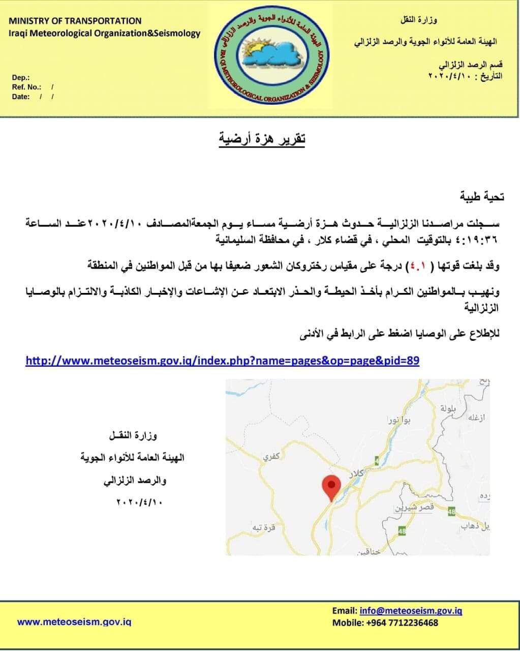 وقالت الوزارة، في بيان تلقته الرشيد، ان مراصد وزارة النقل سجلت حدوث هزة ارضية مساء الجمعة، الموافق 10/4/2020 في تمام الساعة (4،19،36) في قضاء كلار في محافظة السليمانية”.