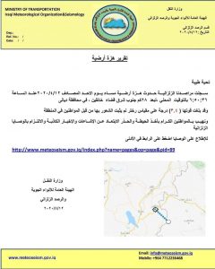 النقل تعلن تسجيل هزة ارضية بقوة 3.4 درجة جنوب شرقي خانقين في ديالى
