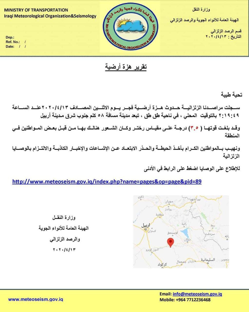 وقالت الوزارة، في بيان تلقته الرشيد، أن “مراصدها الزلزالية سجلت حدوث هزة أرضية فجر اليوم الأثنين المصادف 13/4/2020، في ناحية طق طق ، تبعد المدينة مسافة 58 كلم جنوب شرق مدينة أربيل”.