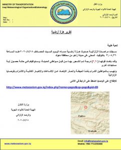 وقالت الوزارة، في بيان تلقته الرشيد، ان المراصد الزلزالية لوزارة النقل سجلت، مساء السبت، الموافق 18/4/2020 حدوث هزة ارضية اليوم في تمام الساعة (3:05:36) بالتوقيت المحلي للمنطقة في مدينة زاخو دهوك”.