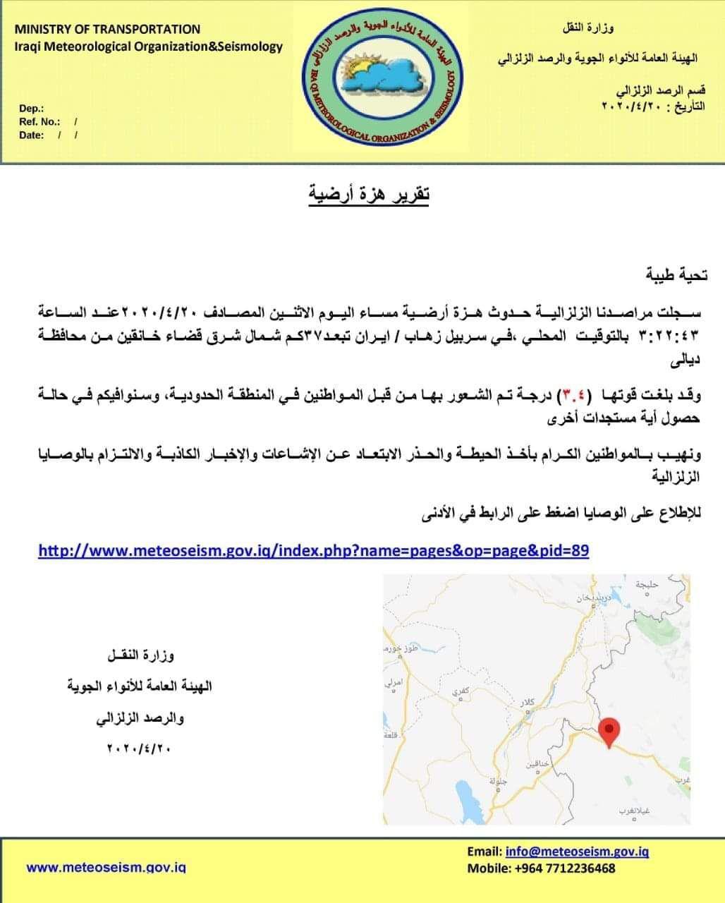 وبينت، أن “الهزة وقعت في سربيل زهاب – إيران وتبعد حوالي (37 ) كم شمال شرق قضاء خانقين من محافظة ديالى ،موضحة ،قد بلغت قوتها ( 3،4 ) درجة على مقياس رختر”، مشيرةً، ، الى انه “تم الشعور بحدوث الهزة من قبل المواطنين في المنطقة الحدودية”. .