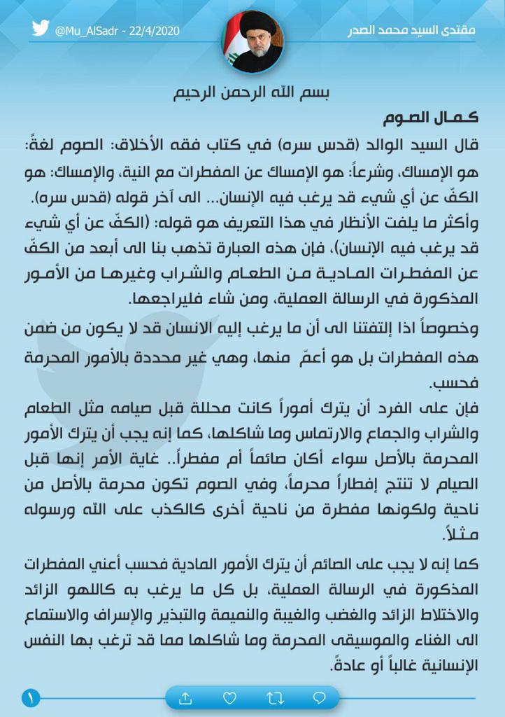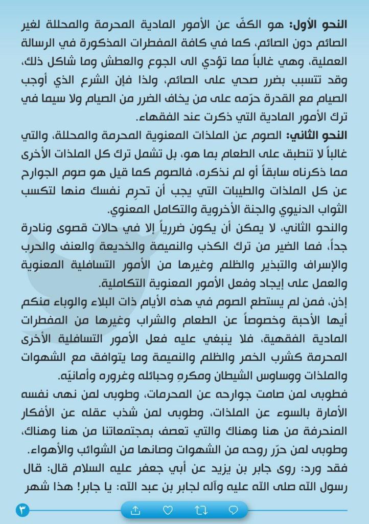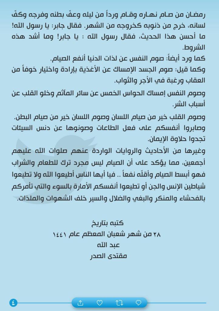 الاخبار العاجلةمحلياتالصدر يغرد بشأن صيام شهر رمضان قبل 6 سنوات 7 مشاهدات شارك قد يهمك أيضا الاخبار العاجلة المبعوث الأممي السابق أخضر الإبراهيمي: الهدف من أفغانستان كان العراق قبل 3 ساعات 17 مشاهدات محليات الأنواء: العراق يتأثر بموجة قطبية تتسبب بانخفاض درجات الحرارة إلى الصفر المئوي أو أدنى خلال الأيام القادمة قبل 4 ساعات 19 مشاهدات محليات العراق يعزي سويسرا بضحايا حادث منتجع كرانس-مونتانا للتزلج قبل 4 ساعات 21 مشاهدات محليات مصرع وإصابة 11 شخصاً بحادثي سير في ديالى والمثنى قبل 4 ساعات 9 مشاهدات أمن مقتل شخص بإطلاق نار وسط مدينة العمارة قبل 5 ساعات 21 مشاهدات