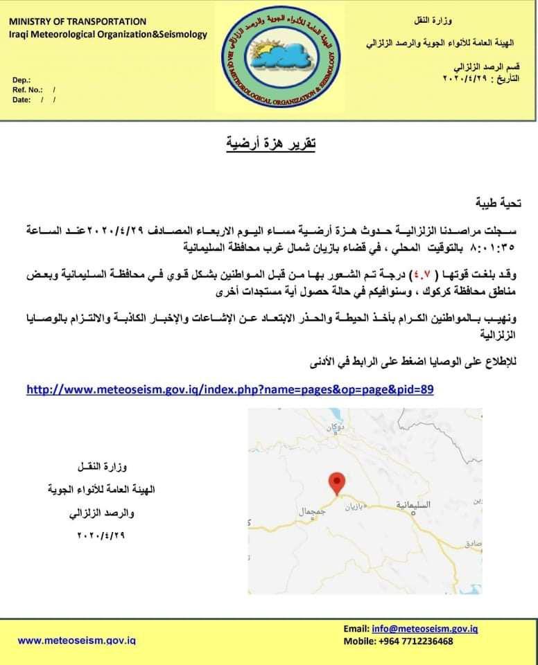 وقالت الوزارة، في بيان تلقته الرشيد، ان “المراصد الزلزالية لوزارة النقل العراقية سجلت مساء اليوم الاربعاء الموافق 29/ 4/ 2020 حدوث هزة ارضية في تمام الساعة (8:01:35) بالتوقيت المحلي في شمال غربي محافظة السليمانية”.