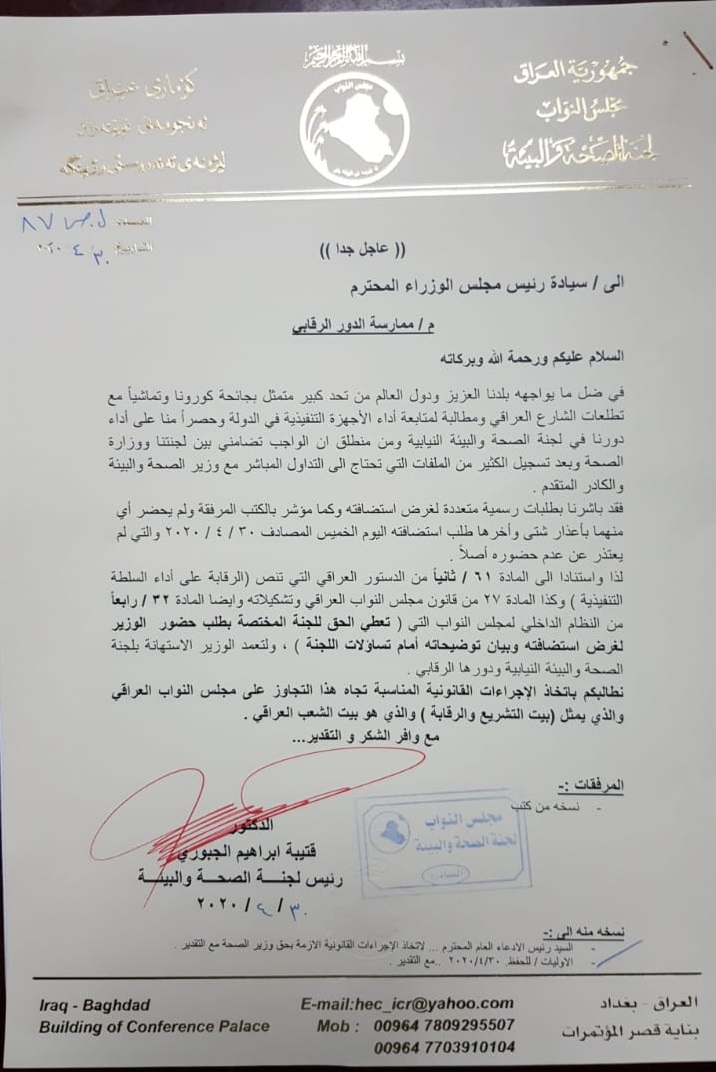 وأضاف الجبوري، ان “اللجنة تبدي أسفها لضعف الأداء الإداري للسيد وزير الصحة وإخفاقه في التعامل مع أزمة كورونا، فبينما يفترض أننا اليوم في سباق مع الزمن، نجد أن اغلب العقود الخاصة بكورونا لم تجهز حتى هذه اللحظة، وبالتالي اضطررنا إلى اتخاذ هذا الإجراء تلبية للمصلحة العامة ولكون التحديات التي يمر بها العراق اليوم لاتحتمل المجاملات بل تتطلب قرارات سريعة وحاسمة”.